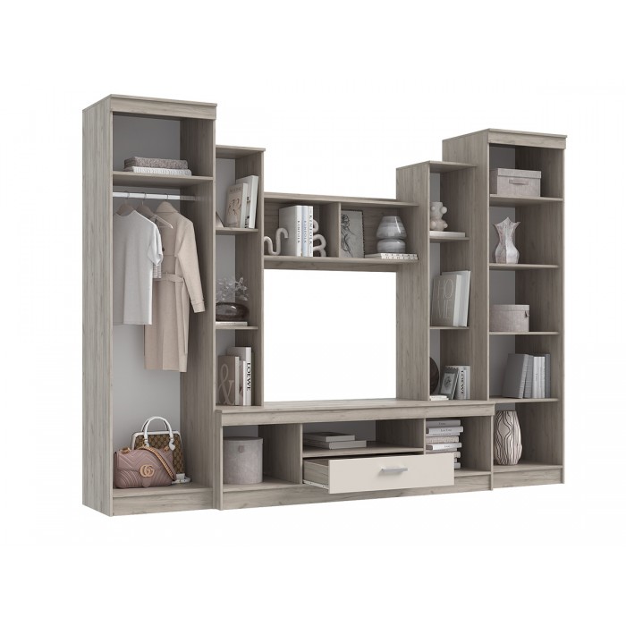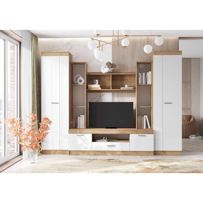 Стенка для интерьера гостиной в классическом стиле, в духе минимализма, с удачным подбором цветовых решений. Стенка "Атлантида-6" сэкономит максимум полезного пространства в небольшой гостиной