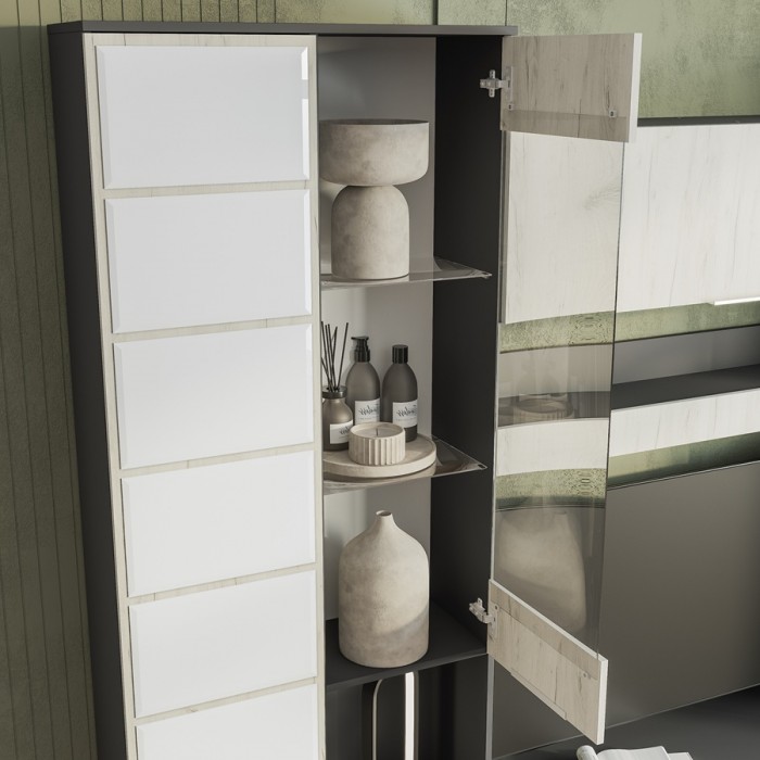Закрытые полки с отделкой фасадов стеклом белый лакобель с фацетом.