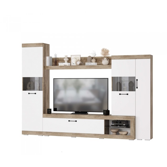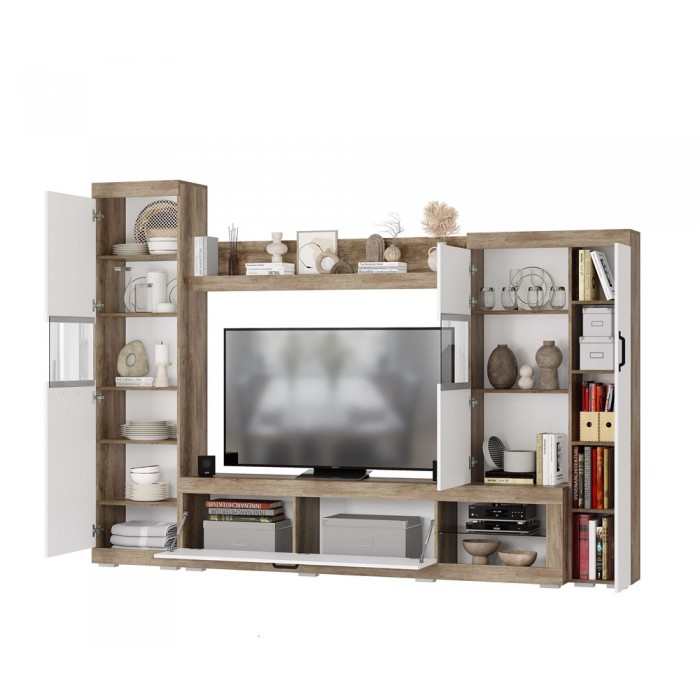 Современная гостиная «Тесла» – это надёжность, практичность и функциональность в интерьере дома, которые подчеркнут Ваше стремление ко всему новому и эксклюзивному. Корпус из ЛДСП цвета «дуб каньон» с эффектом натурального спила элитного сорта дуба, имеющего пористую текстуру с выделенной структурой древесных волокон идеально сочетается с однотонными фасадами облачно белого цвета.