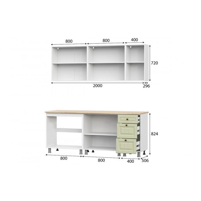 2.0 м.(Верх: ШВГС800-2шт, ШВ400, Низ: ШНМ800, ШН2ЯГ800, ШН1Я400, Столешница 800+400 мм)