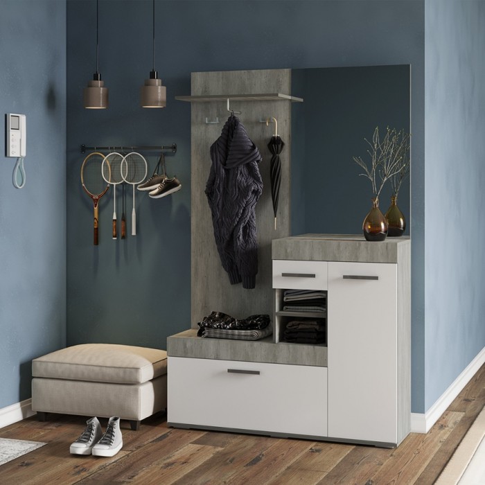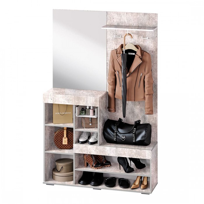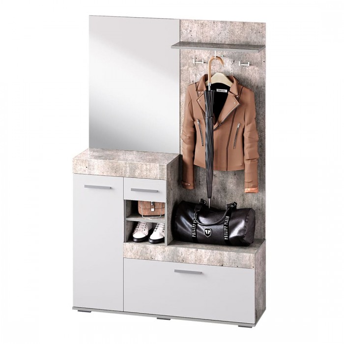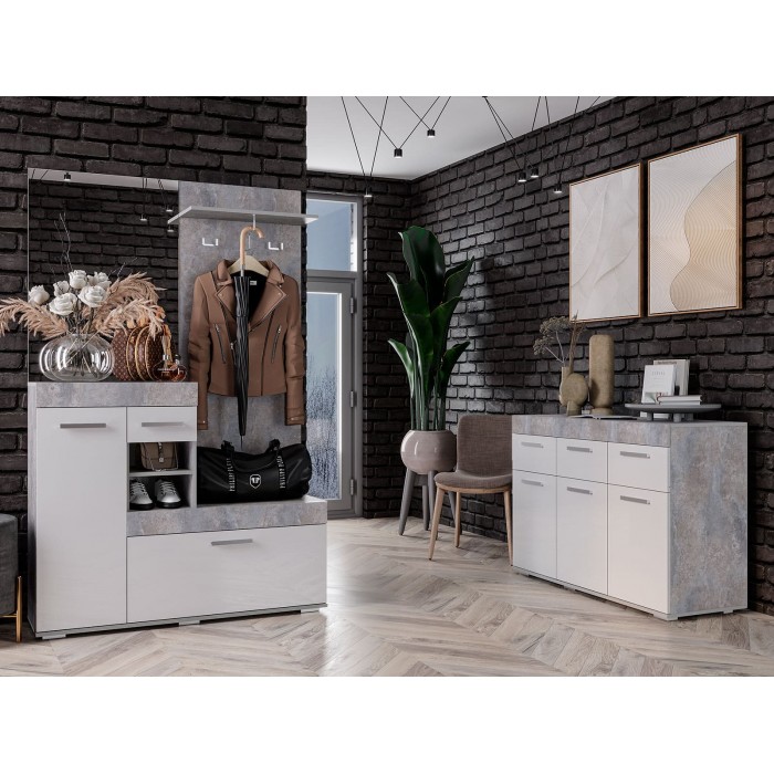 Небольшая, но стильная модель "Инстайл" станет прекрасным выбором для решения хранения в прихожей. Сочетание белого матового и фактуры бетона, а также наличие большого зеркала облегчают конструкцию и позволяют ей расширить пространство. Все створки, за которыми спрятаны полки для хранения вещей и обуви, оснащены эргономичными хромированными ручками.