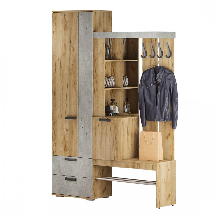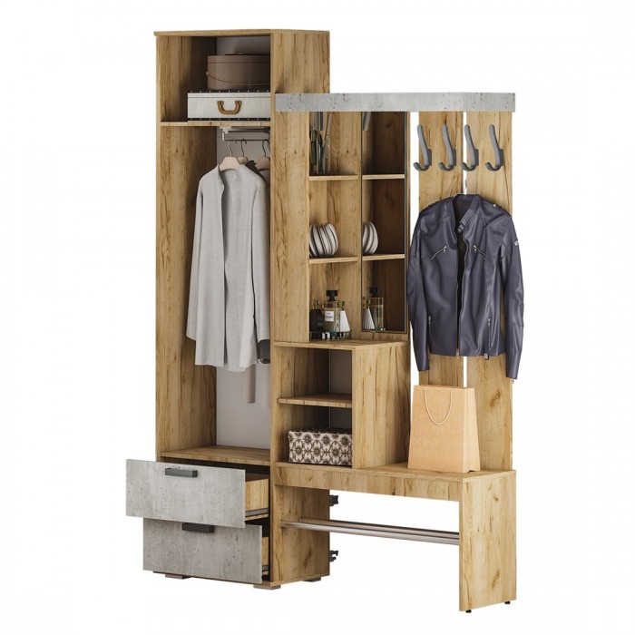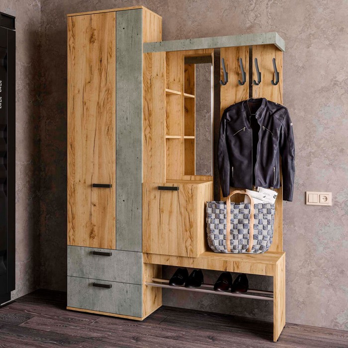 Идеальный выбор для современного интерьера, особенно в стиле "лофт", – это прихожая "Трамп". Модель выполнена из ЛДСП двух цветов – "крафт" и "бетон", изделие имеет все необходимые зоны для размещения вещей в прихожей: крючки для верхней одежды, открытые и закрытые ниши, шкаф с выдвижной штангой и зону для хранения обуви.
