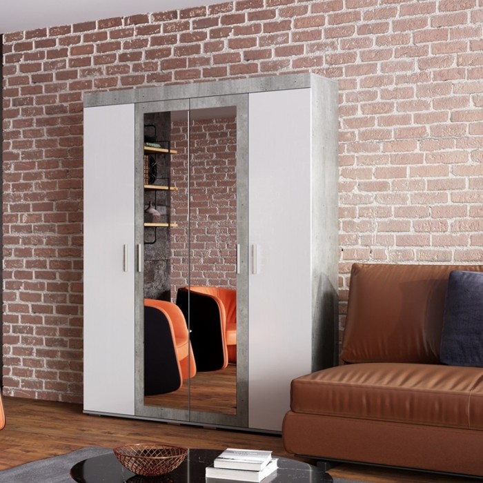 Современный четырёхстворчатый шкаф "Инстайл" выполнен в стиле одноименной модульной коллекции мебели. Модель состоит из четырех дверок, две из которых – зеркальные. Изделие выполнено в комбинации белого и цвета "бетон". Шкаф состоит из двух отделений со штангами, а также верхних и нижних полок для вещей. По желанию Вы можете заменить штанги полками ПЛ-08, которые приобретаются отдельно.