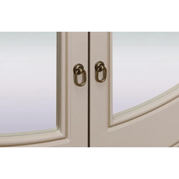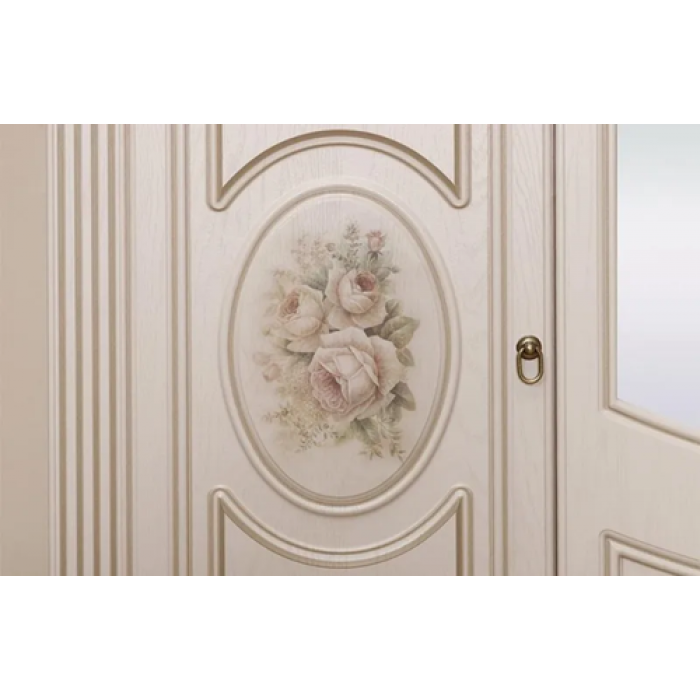 Фасады мебели декорированы элегантной фрезеровкой с эффектом патины и медальоном, на котором изображены розы. Для удобства использования дверцы и ящики оснащены темными металлическими ручками, имитирующими ковку.