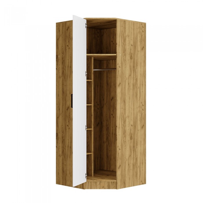 Угловой шкаф «Евро» - лучший выбор для тех, кто хочет сохранить максимум свободного пространства в комнате. Компактный, но вместительный шкаф позволит хранить большой гардероб. Модель оснащена секцией с крепкой штангой, полками и просторной полкой.