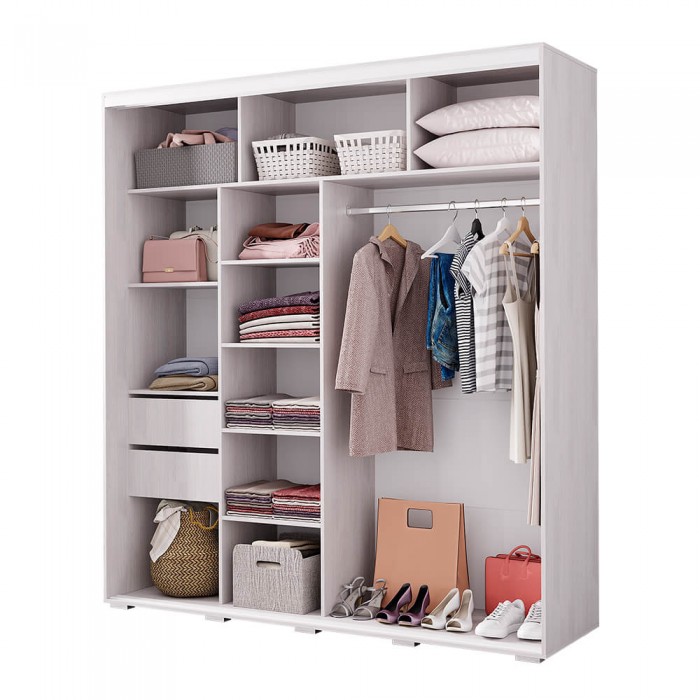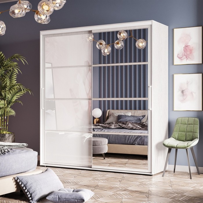 Система хранения шкафа включает в себя отделение для хранения, два ящика, антресоль и плательный отсек. В оформлении левой створки шкафа присутствуют зеркала во весь рост, что изменяет восприятие пространства комнаты, создает объем и глубину. Оригинальный дизайн правой створки с использованием стекла лакобель подчеркивает игру света и тени, а также придает необычную передачу движения находящихся в комнате людей. Универсальность шкафа позволяет осуществлять сборку как на правую, так и на левую сторону. Плательный отсек с овальной хромированной штангой длиной 772 мм организуют удобное хранение достаточно большого количества одежды на вешалках.