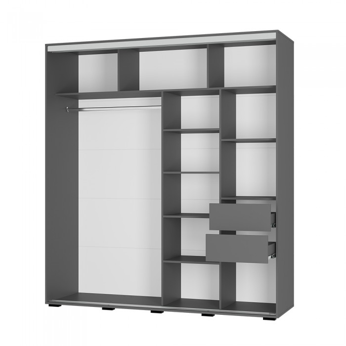 Практичный и многофункциональный шкаф-купе "Крафт-9" подойдет для любой комнаты вашей квартиры или дома. Двери шкафа оснащены стильными длинными вставками из черного МДФ -профиля, выполняющими роль ручек. Шкаф украшен роскошным зеркалом с интересной геометрической формой, которое не только выполняет свою практическую функцию, но и становится изысканным акцентом. Лакобель в черном цвете добавляет интерьеру глубину и шарм, придавая ему стильный и солидный вид.