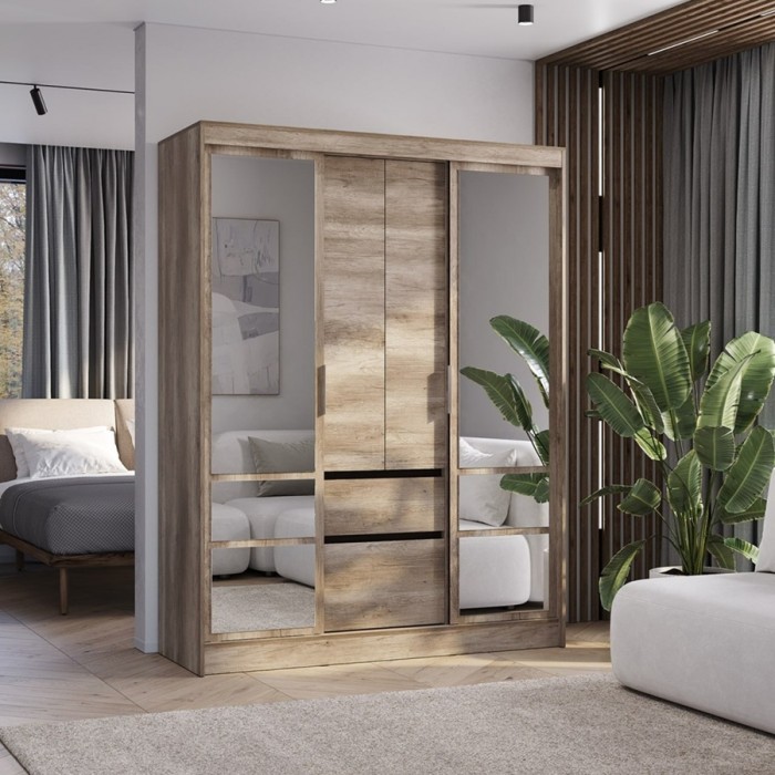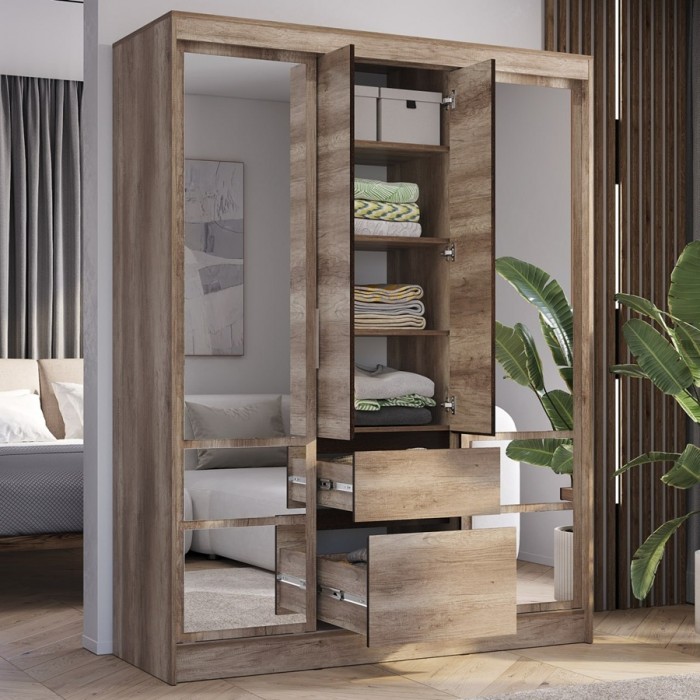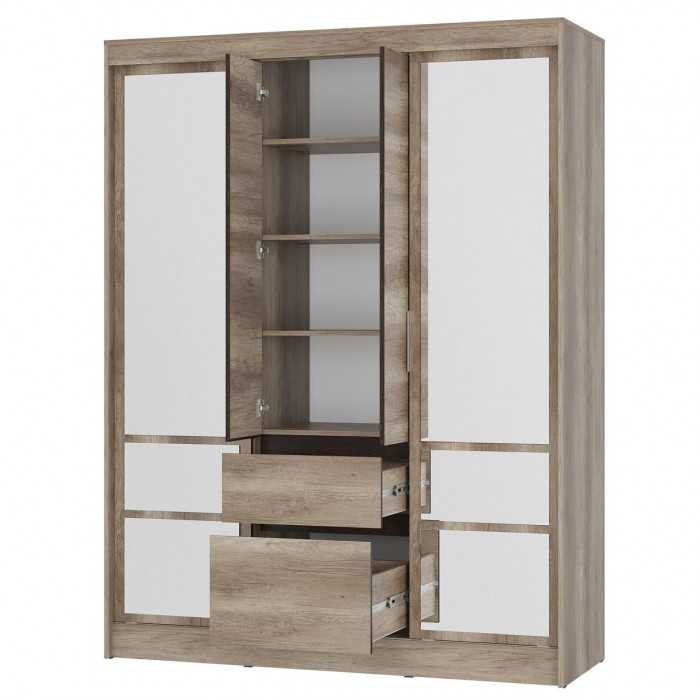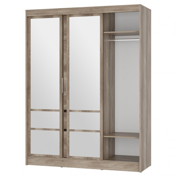 Шкаф-купе «Энигма» — вместительная и эстетичная модель для тех, кто предпочитает лаконичные интерьерные решения. Шкаф оснащен удобными ящиками и полками, а также пространством для вертикального хранения вещей. Вам не придется покупать большое зеркало, ведь фасад этой модели оснащен зеркалами с еврокромкой в комплекте, которые клеятся на фабрике.