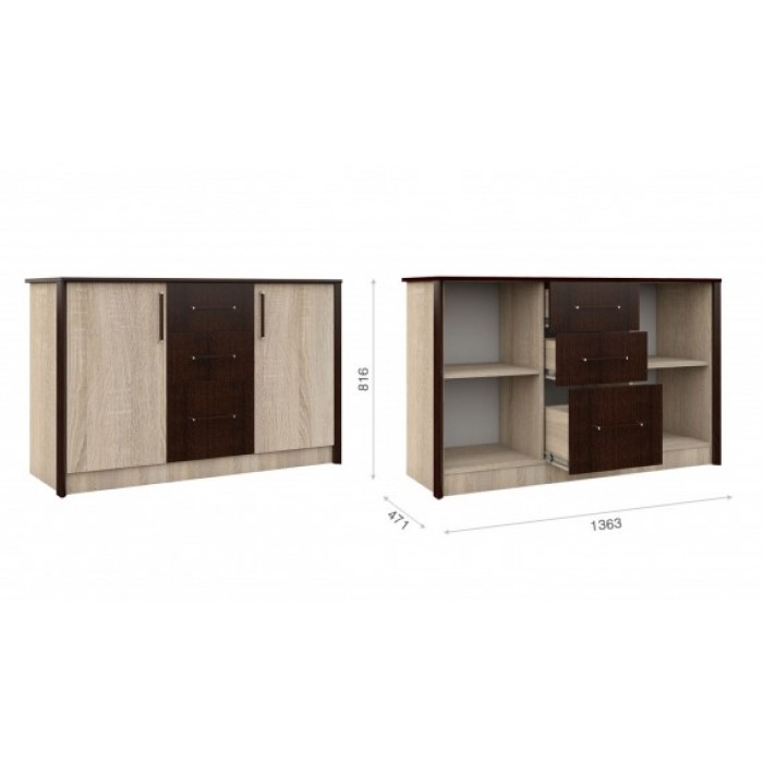 Вместительный комод Эшли подходит для хранения белья, одежды, текстиля. Центральную часть занимают три ящика с направляющими полного выдвижения, по обеим сторонам симметрично расположены секции, в каждой из которых имеется по одной полке. Скругленные края верхней крышки и профиля МДФ 22мм по вертикальным сторонам комода – максимально безопасное использование мебели. Кромка цвета венге в сочетании с контрастными вставками подчеркивают древесную текстуру и рисунок светлого дуба сонома.