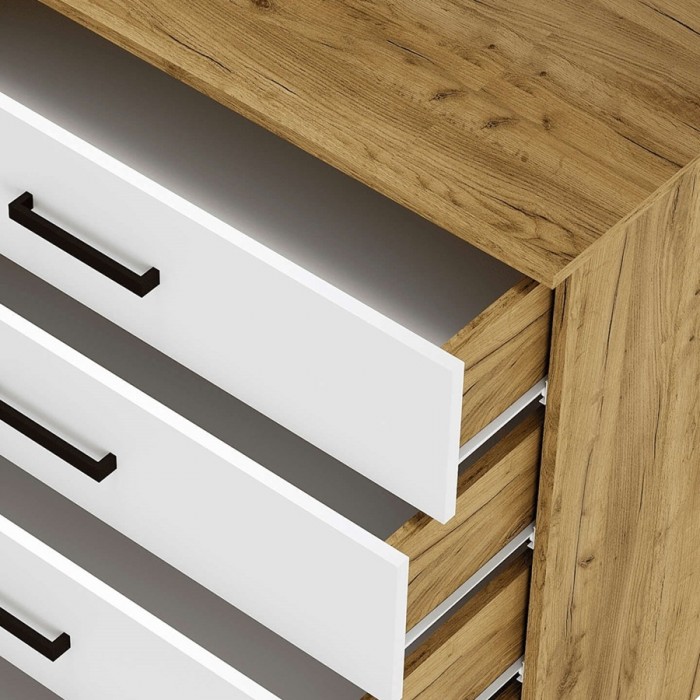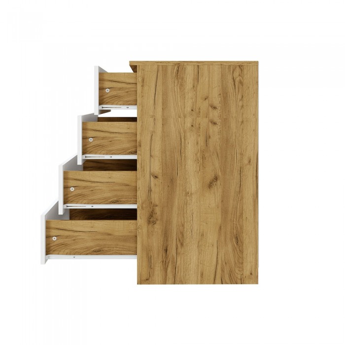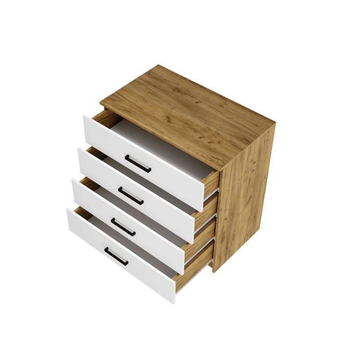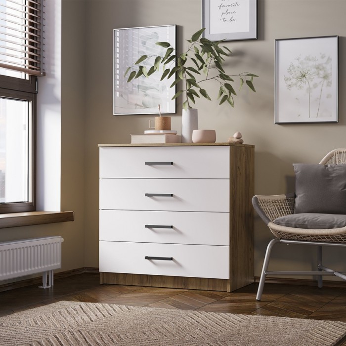 Комод в приятных и легких оттенках "крафт" и "белый" – это эстетичное и функциональное дополнение для вашей спальни или гостиной. Модель создана из высококачественного ЛДСП. Комод состоит из четырех вместительных ящиков с эргономичными стильными ручками.