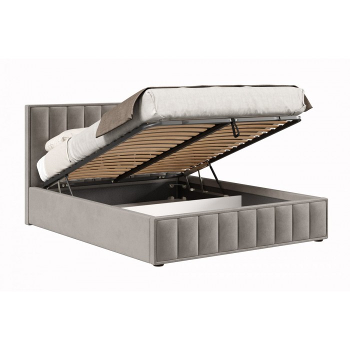 Удобный подъемный механизм на газовых лифтах дает возможность мягко и плавно поднимать металлическую кроватную решетку с матрасом практически без прикладывания каких-либо усилий. Объемный короб достаточно вместителен, чтобы в него можно было поместить не только постельное белье, но и другие вещи. Каркас изделия выполнен из древесины.