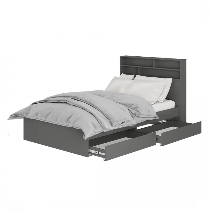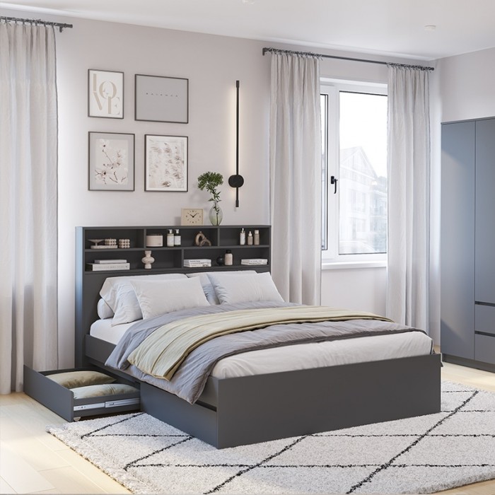 Кровать оснащена выкатными ящиками, в которых легко размещается постельное белье, текстиль и другие вещи, которым не нашлось места в шкафу.