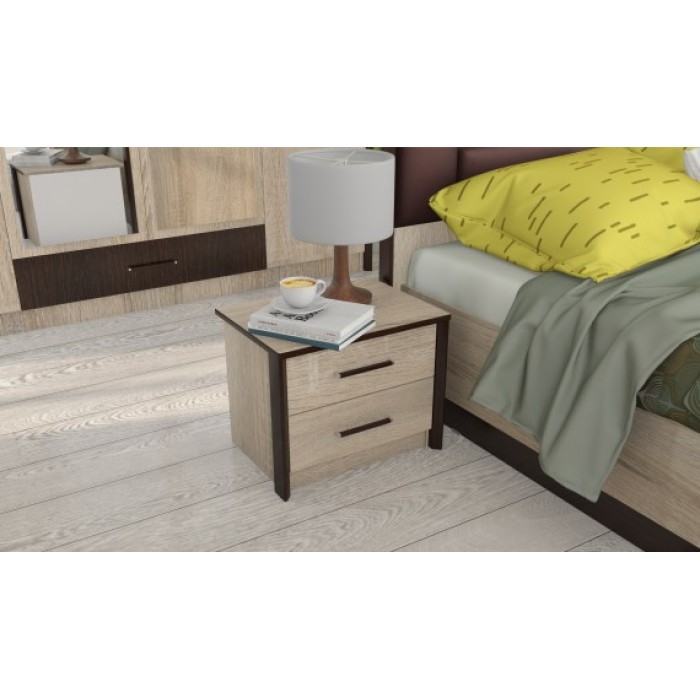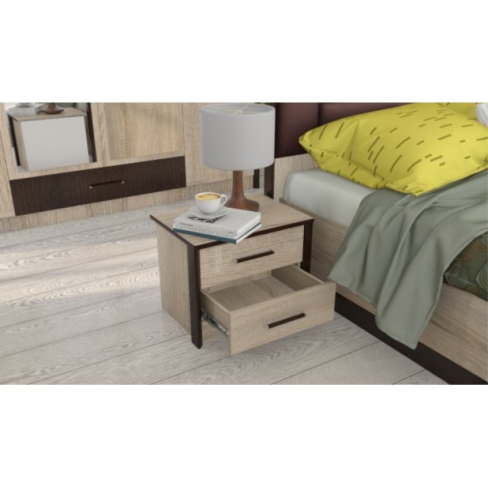 Прикроватные тумбы Эшли выполнены в стиле минимализм: строгие черты, функциональность и простота. Контрастный профиль из МДФ 22мм по внешним углам со скругленными краями для максимально безопасного использования мебели. Кромка цвета венге подчеркивают древесную текстуру и рисунок светлого дуба сонома, придает эффектный вид. Прикроватные тумбы с двумя ящиками на телескопических направляющих поместят в себя все вещи, которые важно иметь под рукой - телефон, светильник или любимая книга. Идеально дополняют кровать Эшли.