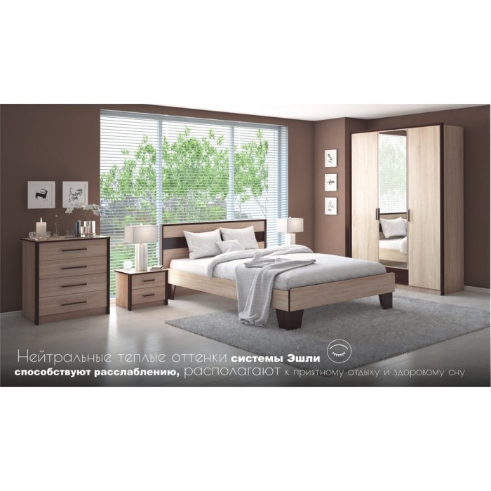 Спальня Эшли – это воплощение современного европейского стиля, в дизайне которой каждый модуль имеет своё практичное назначение. Благодаря сочетанию цветов светлого дуба с контрастными планками, Вы сможете создать яркий и функциональный интерьер, отражающий ваши вкусы и предпочтения. Спальня – это сердце дома, так как она часто служит сразу для отдыха, гардероба и работы. Система Эшли состоит из 10 модулей, которые позволяют выбрать все нужные элементы мебели в едином стиле. Кроме этого, мебель в спальне напрямую влияет на качество сна и наше здоровье, поэтому всё должно быть максимально безопасным и экологичным. При создании системы Эшли реализованы в полной мере «зеленые» принципы. Система выполнена из высококачественных материалов.